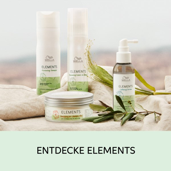 Elements ist die sanfteste Haarpflegelinie von Wella Professionals für ein Gefühl von gesundem Haar und Kopfhaut. Fühle den sanften Unterschied mit unseren pflegenden und hochleistungsfähigen Rezepturen mit bis zu 99 % Inhaltsstoffen natürlichen Ursprungs*, frei von Inhaltsstoffen tierischen Ursprungs und formuliert ohne Silikone und Sulfate. Erlebe die Pflegeprodukte, die nicht nur sanft zum Haar und der Kopfhaut und dermatologisch getestet sind, sondern auch in einer verantwortungsbewussten Verpackung aus bis zu 100 % recycelten Plastikflaschen und -tuben kommen**.